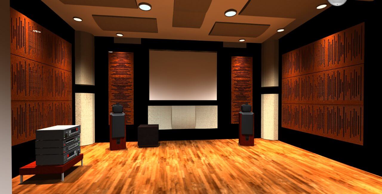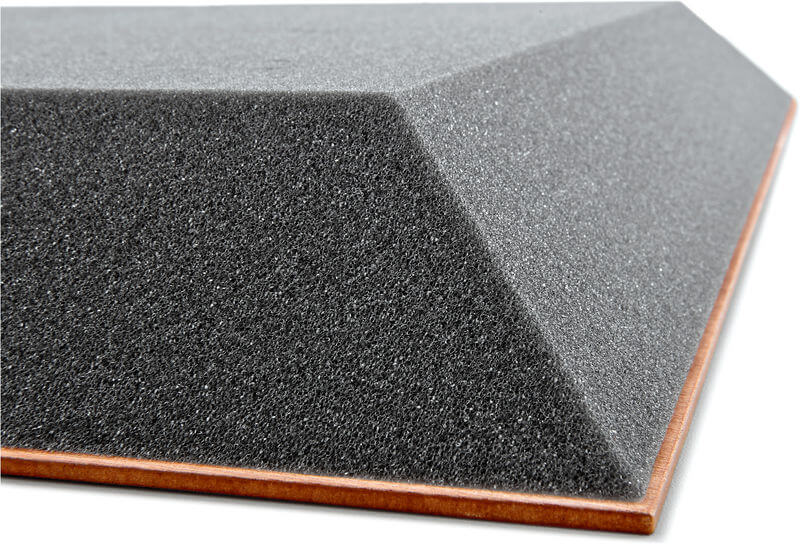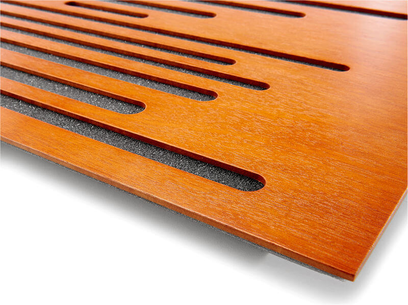 יחידה של לוח סופג אקוסטי המפזרות וסופגות סאונד, בגימור עץ דובדבן מסדרת Wavewood של Vicoustic