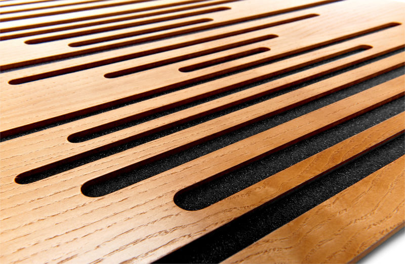 יחידה של לוח סופג אקוסטי המפזרות וסופגות סאונד, בגימור עץ חום בהיר מסדרת Wavewood של Vicoustic