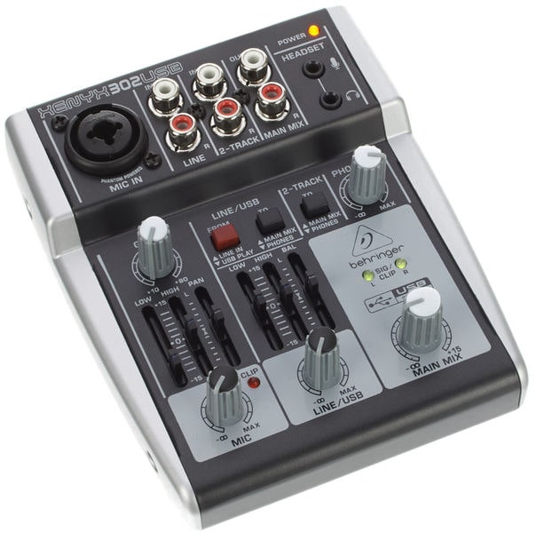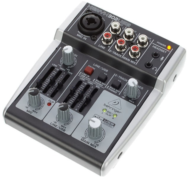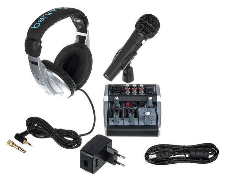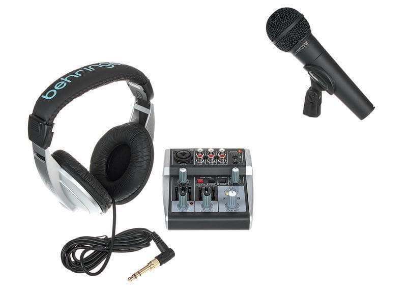 ערכת פודקאסט קומפקטית הכוללת: מיקסר – Xenyx 302 USB Mixer, אוזניות – HPM1000, ומיקרופון XM8500 של Behringer